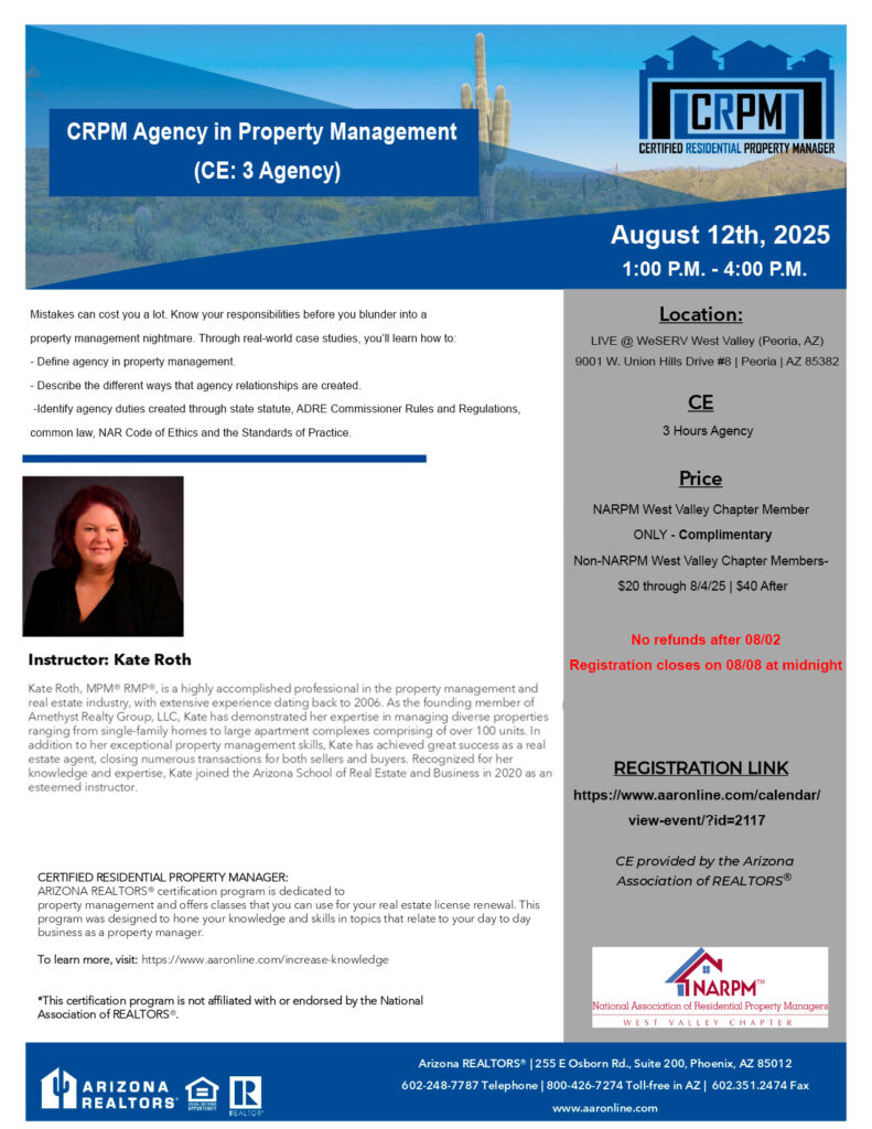 Aug 12th- West Valley NARPM CE Class- Agency in Property Management